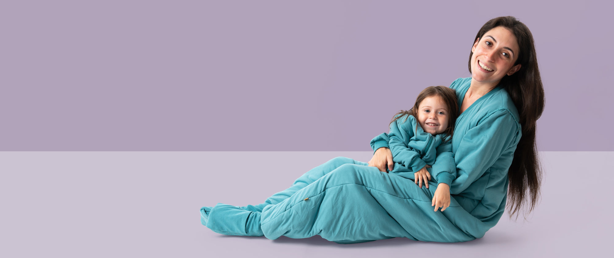 woman with her daughter wearing teal sleeping bags with feet